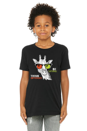 Our 'Think Different' Giraffe Youth Graphic Tee — is soft, comfortable, and inspiring. Made with 90% Airlume combed and ring-spun cotton and 10% polyester, it offers a cozy feel for kids on the go.