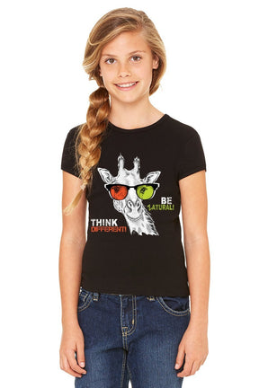 Our 'Think Different' Girl's Graphic Tee — a fun and inspiring choice for kids who celebrate their individuality. This tee features a playful giraffe graphic with a message reminding kids that it's okay to be different.